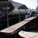 Large sizes gangway-davit in two sides, re-entering in an auto-supporting box. It is fully hydraulic, built in stainless steel with staircarpet in teak and automatic stanchions. It consents lifting and movement of loads up to 700 kg. an hydraulic windlass consents vertical translation of the lifting hook for an easy movement of the load. Standard equipments: Orion gangway is furnished with hydraulic pump, electronic box with a manual control and a remote control. The electronic box is programmed for a complete automation and control of all movements. By request equipped with optical fibres.