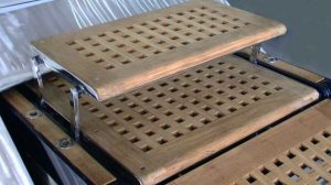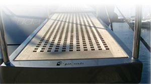 New model of gangway expressely thoght for big boats. As to respect the consolidated tradition of the firma, §Gemini Special§ is built with the best materials, as teak for the staircarpet and stainless steel for the entire structure. Its most important peculiarity consists in astainless steel trolley sliding on agears system that works thank to a belt drive actuated by an oil-dinamic engine; this system confers absolute stiffness, it results extremely silent, and reduces at least the maintenance activities. Besides, and itçs really notable, the trolley forecasts an hydraulic step to ease the accessibility on board. Special fittings: optical fibres for nightly lighting of the staircarpet; inhibition mycroswitches that hinder the movement of the telescopic parts and the automatic re-enter of the gangway when there are stanchions.