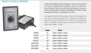 The magneto-hydraulic breaker protects motor from overcharges and short circuits. It has been studied for D.C. employ and it intervenes in case of over-current breaking the circuit in order to avoid to damage the motor. It is available in three versions, according to the capacity of the motor, power supply 12/24Vdc.