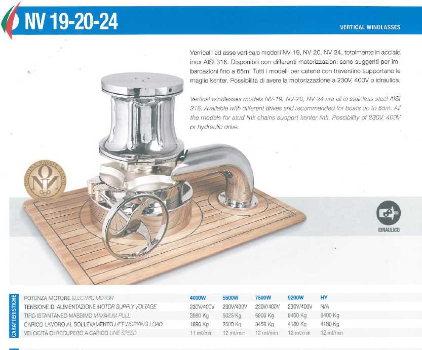 Safety standards and certifying bodies require peremptorily that, during the standing of the anchor, the load must be held by a chain stopper or a high resistance fixing point. The user is responsible for guaranteeing that during navigation the anchor is properly stowed and fixed. This precaution is more important when the navigation speed is higher and sea conditions are worse. Indeed, an anchor paid out by mistake during navigation can have very serious effects.Considering its position and not always frequent use, the anchor windlass is particularly exposed to oxidation and corrosion risk; therefore, it is necessary to arrange a constant inspection of its parts and a due maintenance.Make sure to have read and understood every part of this manual before proceeding with installation and use.Only persons who know how to operate should be authorised to use the anchor windlass. Should there be doubts on its installation or use, refer always to a skilled consultant.• Anchor windlasses used in an inappropriate way can cause damages to persons and/or things.• Pay the utmost attention during the use of powerful equipment.• Even the most careful use can be a source of damages, even serious.• Italwinch products are supplied exclusively for recreational nauticaluse. Italwinch declines all responsibility for improper uses.• Pay the utmost attention so that arms, legs, fingers, hair, and clothes do not get entangled in the chain or gipsy.• Before operating the capstans, makesure that there are no persons in water in the vicinity.• When the capstan is not used, theanchor must always be fixed to a solid point in order to avoid damages.•The anchor windlass must never be used as mooring point. The load must always be held by a specific leat or solid point.• The capstan must not be used for functions other than paying out or weighing the anchor.• The chain must never be used on the warping drum.• The system must always be protected by a suitable circuit breaker.• Disconnect always the circuit through the circuit breaker when the anchor windlass is not in use