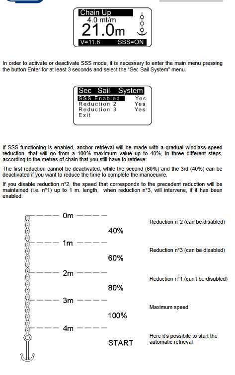 In case you need to accelerate retrieval procedure it is possible to deactivate SSS function and the device functions without speed regulation. In this mode we recommend you to activate ”alarm up” (please see EV030 manual) in order to be warned whenever the anchor has been fully retrieved.If the SSS function has been activated ”alarm up” is automatically deactivated, because retrieval is made through a gradual speed regulation that allows to complete the manoeuvre safely, positioning the anchor in the bow roller without any hit.