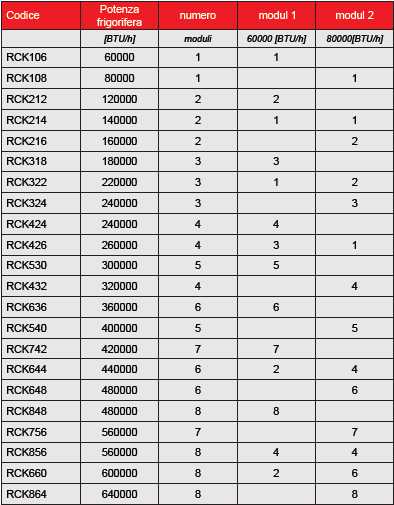 | codice | potenza frigorifera | numero | modul 1 | modul 2 |