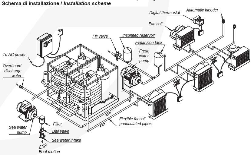 Each single module is equipped with a single highly efficient scroll compressor, a cupronickel condenser, a stainless steel brazed plate evaporator, a thermostatic valve, a cycle inver- sion valve for the heat pump heating. Basement, structure and panelling – if requested – are entirely realized in stainless steel AISI316